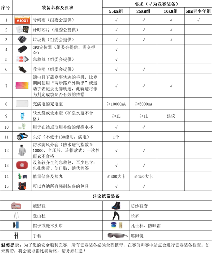 2、选手在比赛过程中必须全程携带与所参赛组别对应的所有竞赛装备,组委会将在起终点、补给站、赛道中进行竞赛装备检查,参赛选手须无条件配合,检查不合格者将接受组委会的处罚,详见处罚办法。