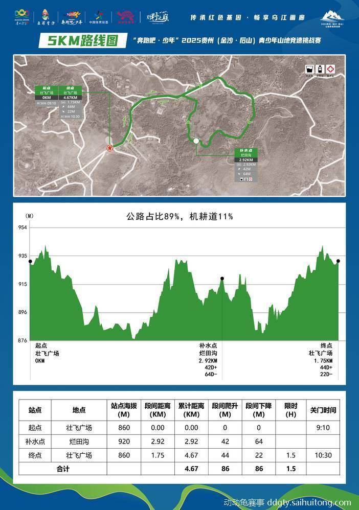 赛道全长4.67KM,累计爬升86米,关门时间1.5小时。