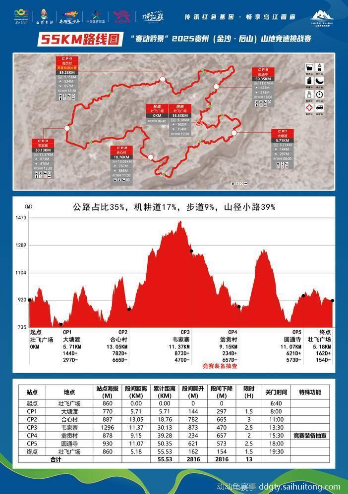 赛道全长55.53KM,累计爬升2816m,关门时间13小时,ITRA积分3分(拟)。公路占比35%,机耕道17%,步道9%,山径小路39%