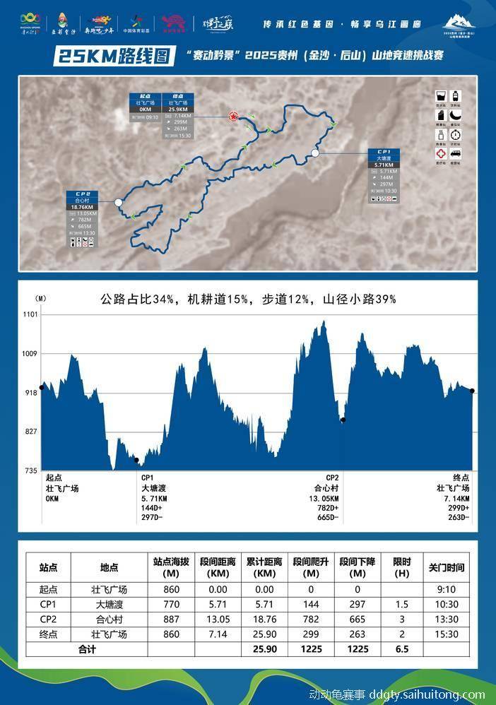 赛道全长25.90KM,累计爬升1225米,关门时间6.5小时,ITRA积分1分(拟)。公路占比34%,机耕道15%,步道12%,山径小路39%。
