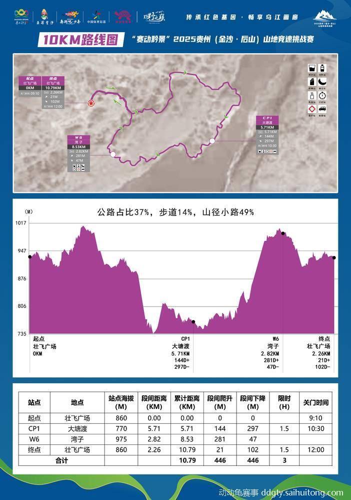赛道全长10.79KM,累计爬升446米,关门时间3小时。公路占比37%,步道14%,山径小路49%。
